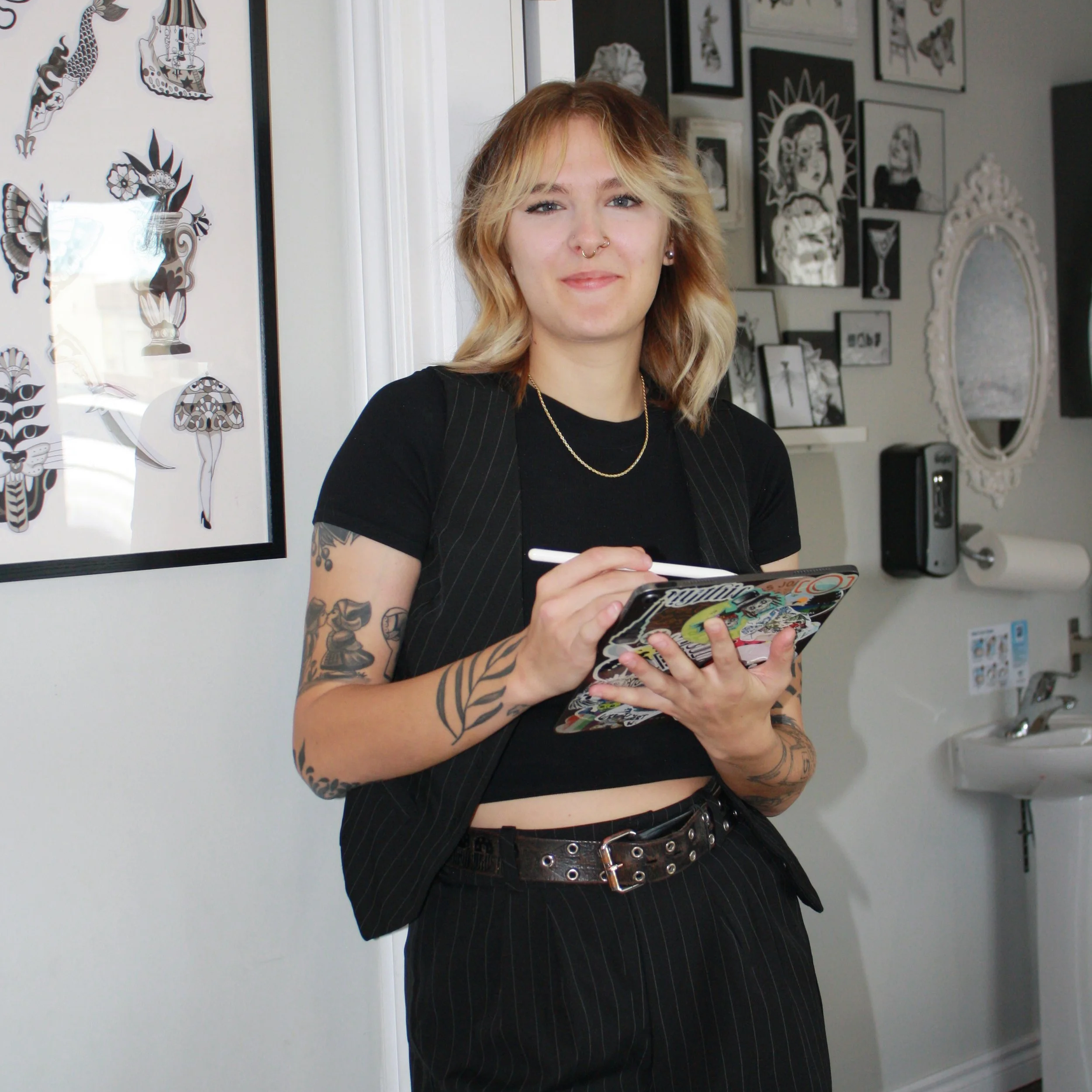 Abi Bos was born and raised in Huron County. She originally came to Tribute Studios as a CoOp student in her final year at CHSS, and after graduating in 2022 she began working at Tribute Studios in Goderich, and studying as a tattoo apprentice.